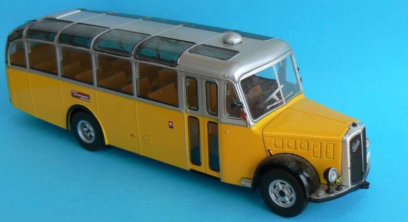 Suisse. Depuis 1903, la société Saurer, installée à Arbon, produisait des camions et des autocars. L'autocar L4C Alpenwagen IIIA est le dernier modèle du type C à moteurs à essence. En 1959, Saurer passe au diesel sur toutes ses productions. Généralement de couleur jaune PTT (des exemplaires seront vernis en gris-vert mat pour l'armée suisse), avec son long museau et son vitrage panoramique, cet Alpenwagen (car alpin) est LE car postal traditionnel ! Doué d'une excellente répartition des masses, monté sur pneus d'hiver avec chaînes, il est idéal pour la circulation sur routes de montagne enneigées, malgré un chauffage correspondant au standard des années '40 (prévoir des vêtements chauds !).