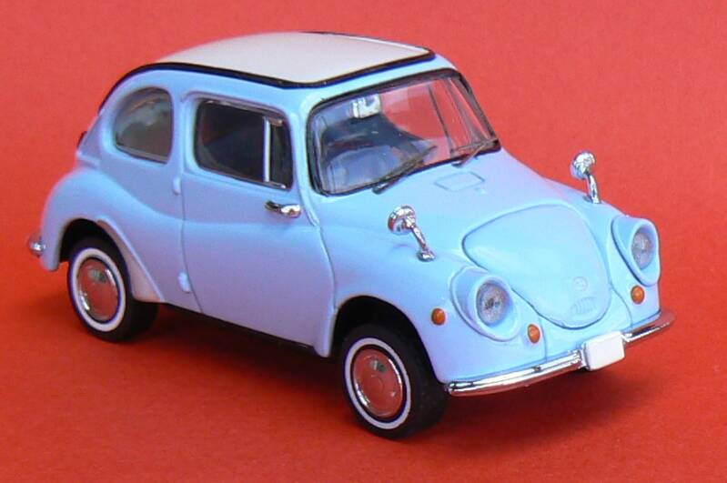 Japon. Première voiture construite par la division automobile de Fuji Heavy Industries, la Subaru 360 est une keijidosha, soit un microcar respectant la législation japonaise prescrivant une longueur inférieure à 3 mètres. Elle possède des performances modestes, comparables à celles de la 2CV de Citroën. Elle gagnera 7 CV supplémentaires en 1960 pour une vitesse de pointe portée à 102 km/h. De conception monocoque, disponible uniquement en coach à sa sortie avec un toit fixe en vinyle, elle existera en découvrable (la 360 Convertible) dès 1959, ce qui, vue de l'arrière, la fera presque confondre avec une Fiat 500, la capote permettant une ouverture incluant la vitre arrière. En 1963 apparaîtra un break 3 portes, nommé Custom, restant dans la limite des 3 mètres mais offrant plus de place grâce à sa face arrière verticale. Les caractéristiques modernes de la 360 lui permettront une carrière de 12 ans en 392000 exemplaires.
