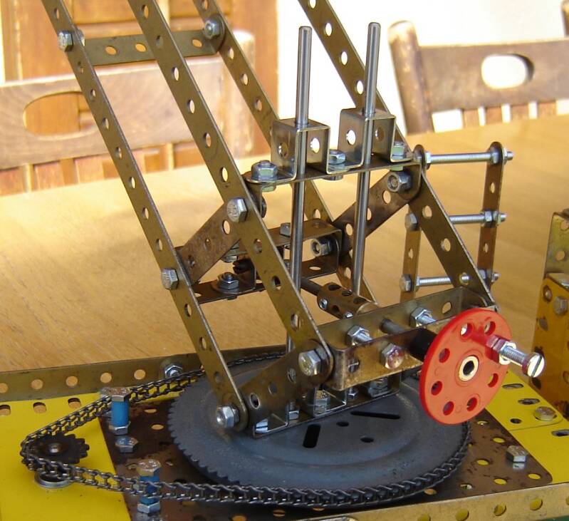 ... sur l'axe de ce pignon, une roue dentée transmet par une chaîne la rotation au roulement à billes No 168 supportant l'articulation de la nacelle.dont la hauteur est réglée avec la manivelle rouge.