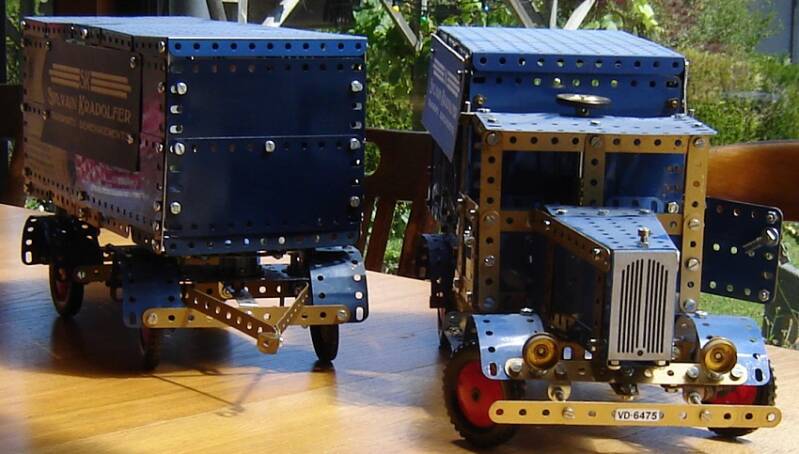 Alors qu'il passait en revue mes constructions, mon petit-fils m'a innocemment demandé : "Et moi ? Je ne pourrais pas avoir un camion à mon nom ? - Pourquoi pas, ai-je répondu, mais à une condition : tu me donnes l'idée du genre de camion à créer." C'est ainsi qu'est née la tapissière, ou camion de déménagement, avec sa remorque.
