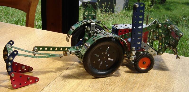 Découvertes dans un lot de Meccano acheté d'occasion dans un vide-grenier, j'avais deux poulies No 19b équipées de pneus No 142b. Que faire de deux roues seulement ?